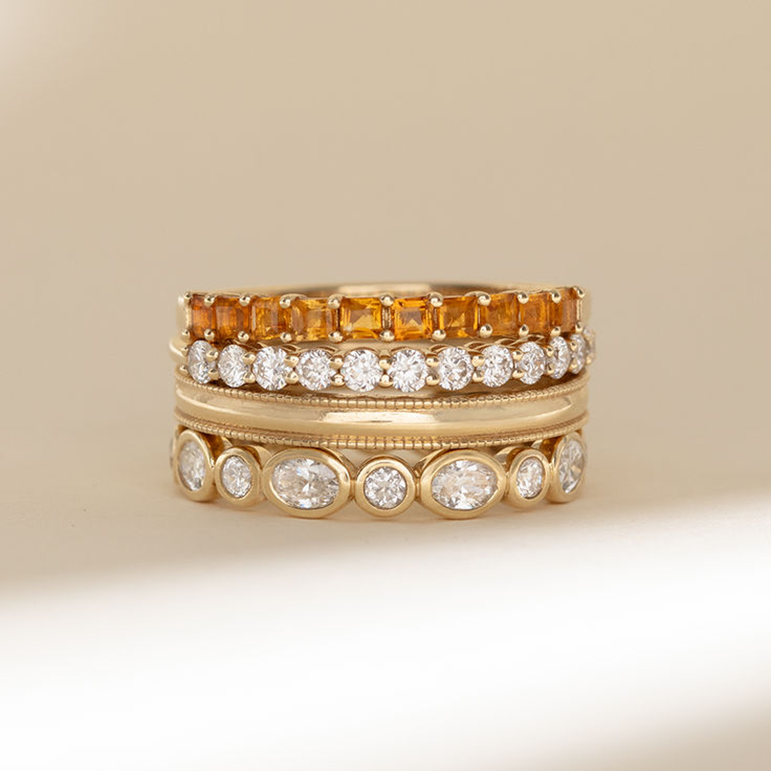 Estos anillos exigen atención a través de variadas formas de piedra y arreglos inesperados. Ya sea que se usen como una poderosa pieza individual o como el ancla de una pila de alto impacto, estas bandas ofrecen una solución lujosa para aquellos que quieren que su anillo de bodas sea tanto una declaración de estilo como un símbolo de amor.